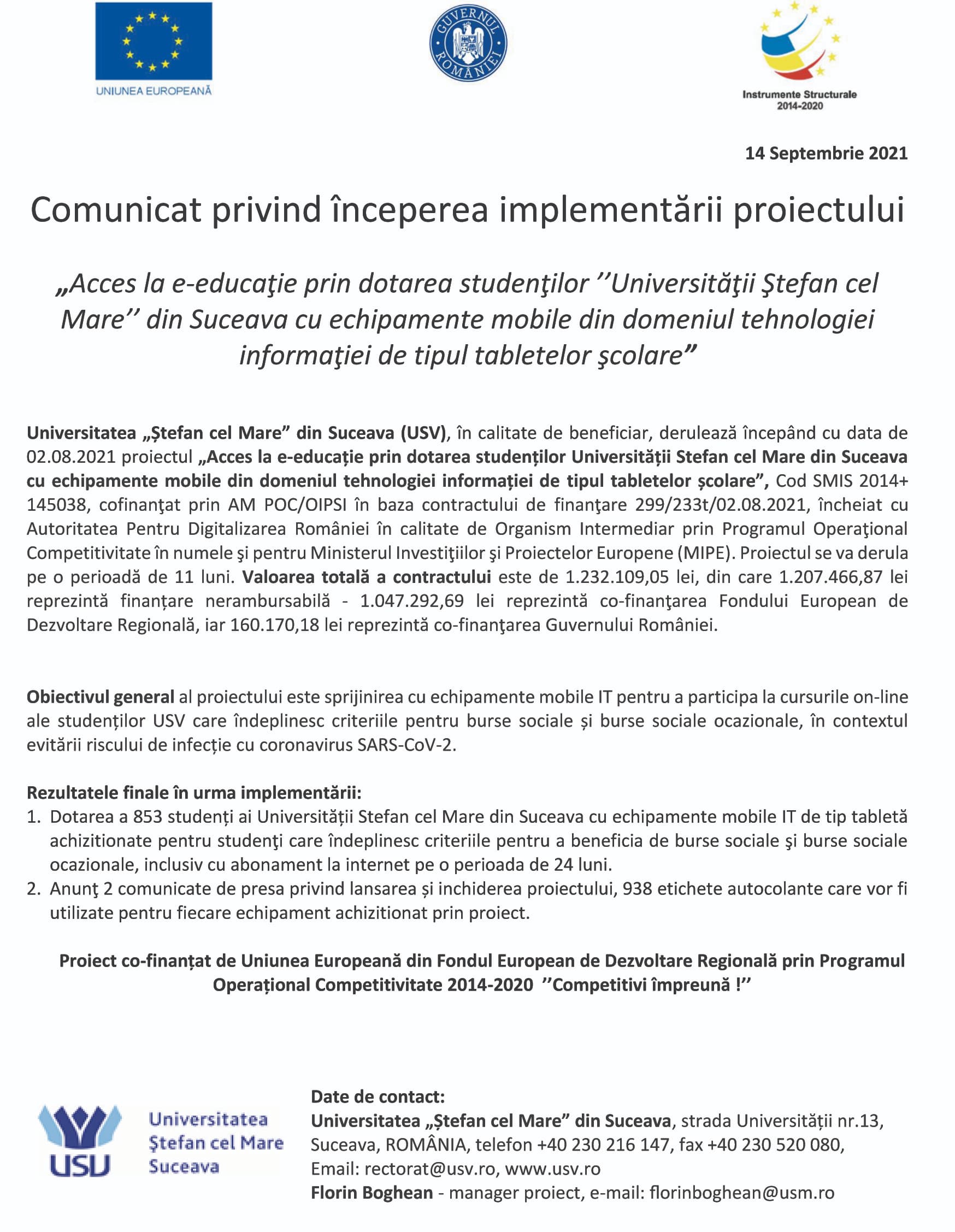 | 2 | Acces la e-educatie prin dotarea studenţilor Universităţii „Ștefan cel Mare” din Suceava cu echipamente mobile din domeniul tehnologiei informației de tipul tabletelor școlare | – | Conf. univ. dr. Florin BOGHEAN | august 2021 – august 2022 | Comunicat de presă 2021 |